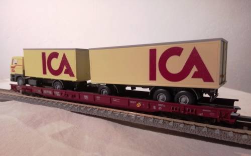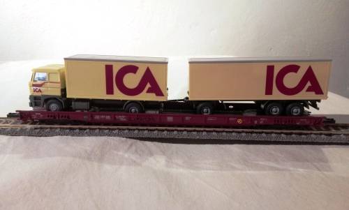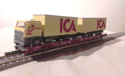 Fleischmann 5277 HO Rolling Road low-floor wagon complete with Wiking Lorry Wagon is in as excellent second hand condition and is supplied in original plastic box which has a cracked lid. The wagon includes moveable chocks to secure the lorry to the wagon and a coupling bar. Note: One no. 5270 wagon, which has hinged buffer beams and Profi couplings (both removable) at both ends, will be required to couple this wagon into a consist. 1 x 5270 wagon also to be listed. TRACK NOT INCLUDED