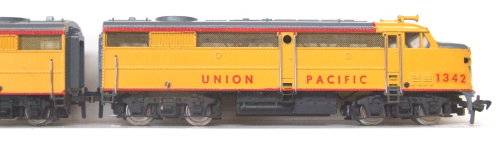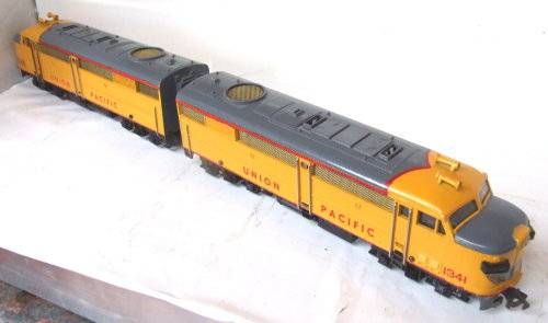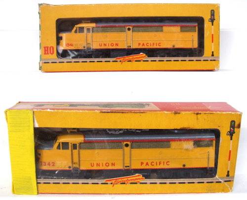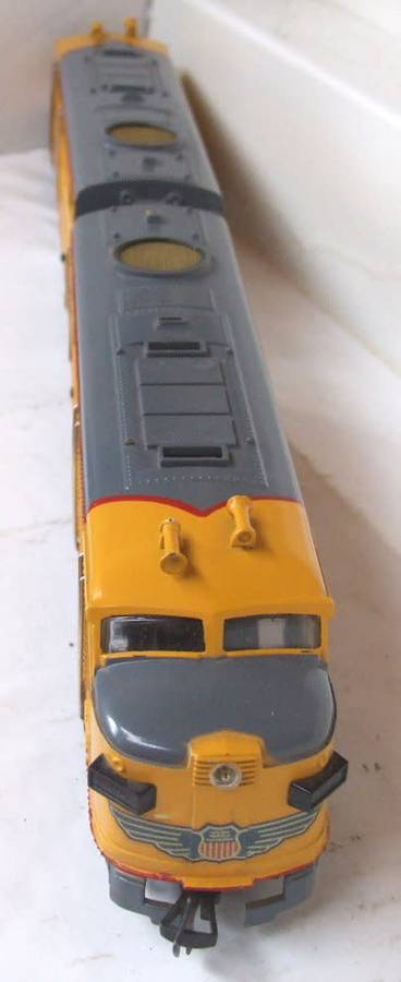 On auction are these all metal highly detailed vintage American Union Pacific diesel Loco & Dummy(no motor) set in very good condition. The loco with working cab/headlight runs fine in both directions. The set measures 420 mm in total length. The paintwork and decals are in excellent shape. All small detailed parts intact on these models. Good old German quality product in very good condition. I think that this loco set is highly collectible at a good price I had to repair one of the boxes. Please see photos for detail for it is part of the description. Contact me by email for inquiries.