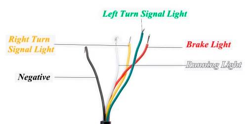 Black wire for negative, red wire for brake, white wire for tail, yellow wire for right indicator and green wire for left indicator