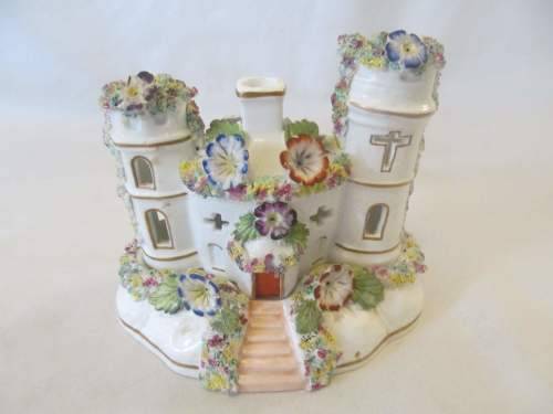 DESIGNED IN THE COALPORT STYLE, A COLLECTABLE FIGURINE OF A CHURCH DECORATED WITH GOLD TRIM AND COLORFUL CAPODIMONTE STYLED FLOWERS ALONG BOTH THE BASE AND THE REMOVABLE CHURCH ITSELF WHICH PORTRAYS A DOOR BOTH AT THE FRONT AND BACK. THE WALLS OF THE CHURCH ARE TEXTURED TO GRANT REALISM