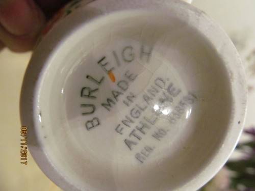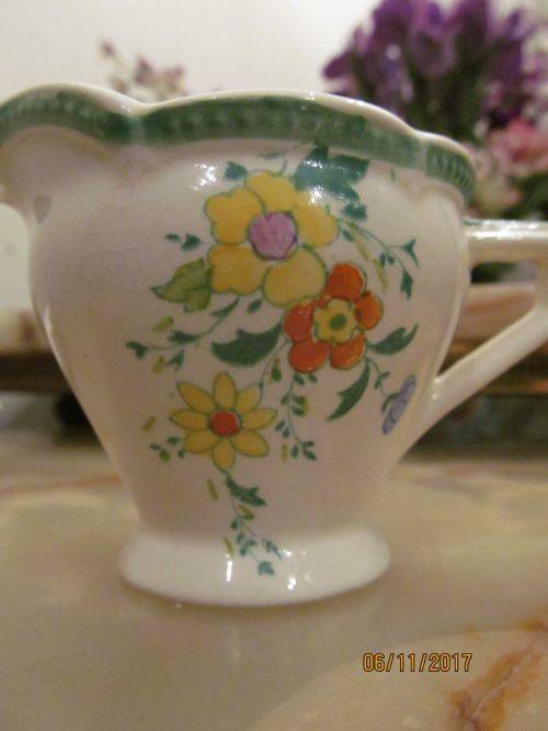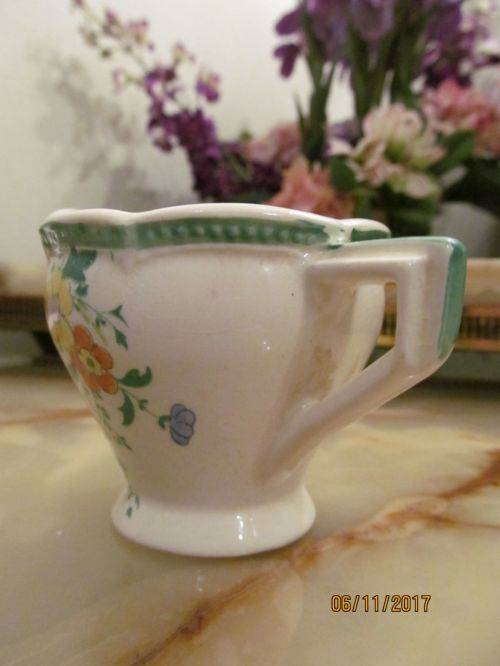 2)- A PORCELAIN CREAMER WITH AN ART DECO STYLE HANDLE DECORATED WITH THE "ATHLONE" PATTERN INCORPORATING MILD GREEN TRIM ON A SCALLOPED RIM AND ON THE HANDLE. ONE SIDE OF THE CREAMER IS DECORATED WITH YELLOW, ORANGE, BLUE AND PURPLE FLOWERS WITH GREEN VINES. THE FRONT AND OPPOSITE SIDE OF THE ITEM HAVE A GREEN VINE PATTERN. THE CREAMER IS STAMPED UNDERNEATH - "BURLEIGH, MADE IN ENGLAND, ATHLONE" THE ITEM HAS FAINT AGE RELATED CRAZING ASIDE FROM WHICH IT IS IN PERFECT CONDITION WITH NO CRACKS, CHIPS OR DAMAGES. THE ITEM IS 6.5cm HEIGHT.....5.2cm LENGTH OF HANDLE.....4cm DIAMETER OF BASE.....6.8cm WIDTH OF RIM .....10.2cm TIP OF SPOUT TO BACK EDGE OF HANDLE
