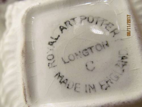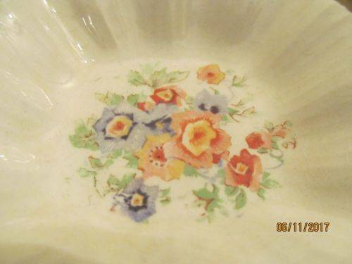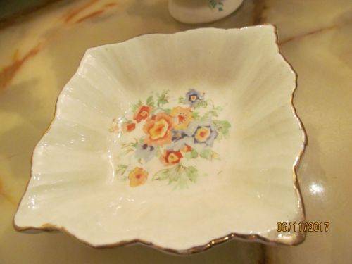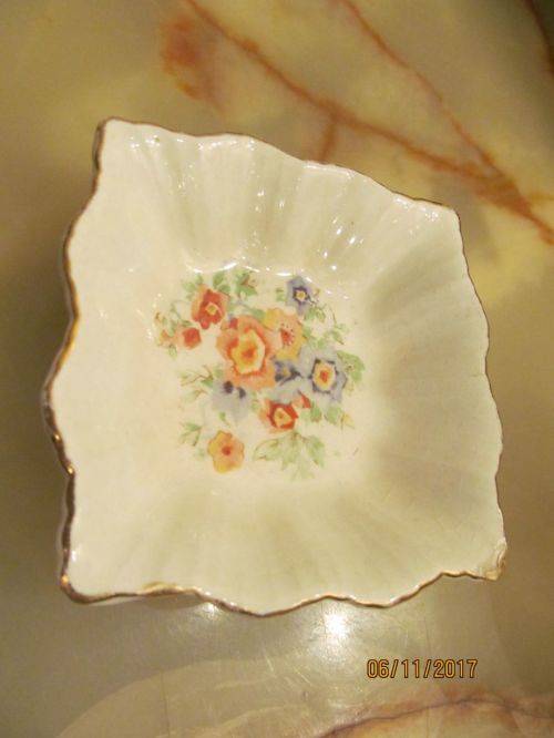 1)- A SQUARE SHAPED TRINKET / NUTS DISH WITH A RIBBED PATTERN IN RAISED DETAIL ALONG THE SIDES AND A SCALLOPED RIM WITH GOLD TRIM. THE ITEM IS DECORATED WITH A COLORFUL FLORAL PATTERN. STAMPED UNDERNEATH -"ROYAL ART POTTERY, LONGTON, C, MADE IN ENGLAND" THE ITEM HAS A TINY ROUGH SPOT ON ONE CORNER WHICH CAN BE FELT WITH A FINGERTIP. TRACES OF VINTAGE PATINA ARE BEGINNING TO APPEAR, ASIDE FROM WHICH THE ITEM IS IN PERFECT CONDITION. 2cm HEIGHT.....8.4cm by 8.4cm SIDES