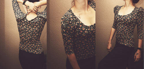 Very cute shirt with fine floral print and some sexy, poofy shoulders. Perfect with jeans or a sexy pencil skirt. Bit worn.