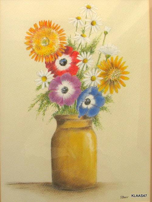FLOWERS ON A VASE : Y. BEER : FRAMED BEHIND GLASS : FRAMED SIZE - 43x54cm
