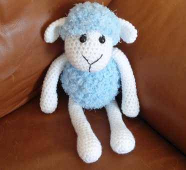 Hand crocheted sheep in white fluffy sheep yarn and pink wool.