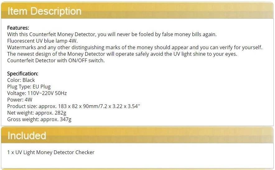 Fluorescent UV Blue Lamp Counterfeit Money Detector