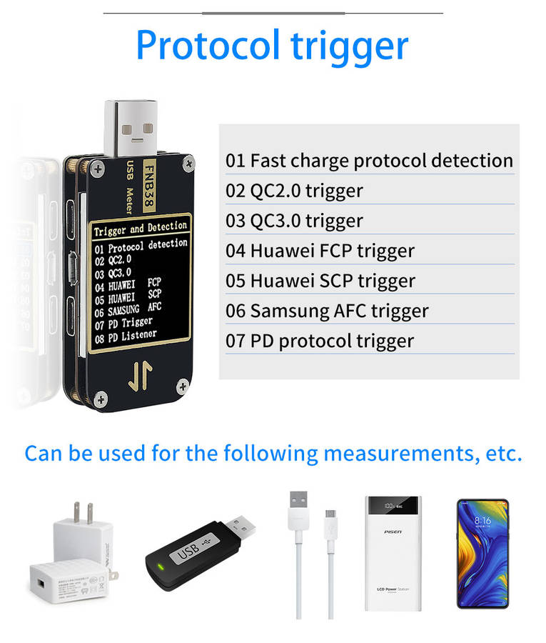 - Can be used for the measurement of rechargers, U disks, data cables, power banks, mobile phones, etc.