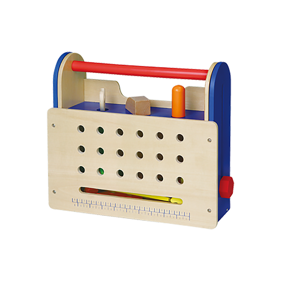 This awesome 32-piece toolset includes a screwdriver, hammer, wrench, 3 gears, 6 hole connectors, 4 nails, 8 bolts and 8 nuts which are neatly stored in a foldable toolbox.
