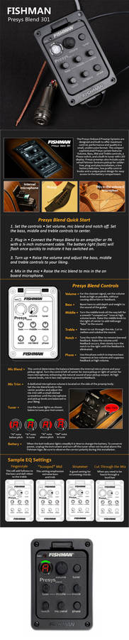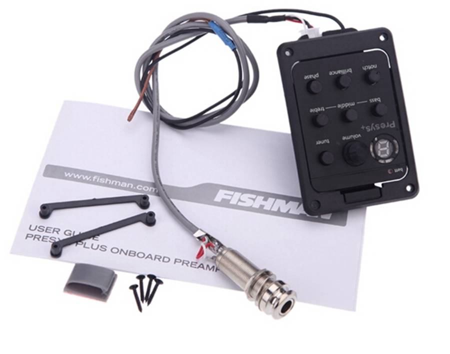 Features: -Small footprint fits many guitars -Volume control -Bass, Middle and Treble control knobs -Built-in tuner with LED display -Phase switch -Low battery indicator -Unique pivots design for instant 9-Volt battery access -Pre-wired Fishman Sonicore pickup for easy, solder-free installation -Low profile control knobs -Onboard anti-feedback control (Notch) -Brilliance control for additional tone shaping -Built-in microphone with mic blend level control Specification: -2.20' W x 3.3' L x 1.625' D (55.8mm x 84.2mm x 41.3mm) -Hole size: 2.0' W x 2.662' L (50.8mm x 67.62mm) -Screw spacing: 1.785' W x 2.795' L (45.34mm x 71mm) -Package size: 24 x 16 x 5.2cm / 9.4 x 6.3 x 2inch -Package weight: 117g / 4.1oz -Part Number: PSY-301 Package Includes: 1x Fishman Onboard Preamps 1x End Pin Jack 4x Screws 1x Manual 2x Mounting Brackets |