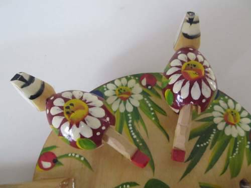 CONSIDERED RARE, A VINTAGE CARVED WOODEN PADDLE TOY DECORATED WITH A MEDITERRANEAN STYLED FLORAL PATTERNING. THE ITEM IS GENERALLY REFERRED TO AS A "PECKING BIRDS" PADDLE TOY WHICH CONSISTS OF FIVE CARVED WOODEN CHICKEN FIGURINES ATTACHED TO THE PADDLE TOP, EACH DECORATED IN FLORAL PATTERNING AND EACH WITH A HINGED NECK. STRINGS ARE ATTACHED TO THE HINGES WHICH THEN PASSES THROUGH SMALL HOLES IN THE PADDLE WHERE THEY ARE THEN ATTACHED TO A CARVED WOODEN BALL. THE MOVEMENT OF THE BALL UNDERNEATH THE PADDLE THEN CAUSES THE CHICKEN FIGURINES TO PERFORM A SIMULTANEOUS PECKING ACTION. THE PADDLE HAS A WOOD HANDLE ATTACHED AND THE ENTIRE TOY HAS BEEN LACQUERED