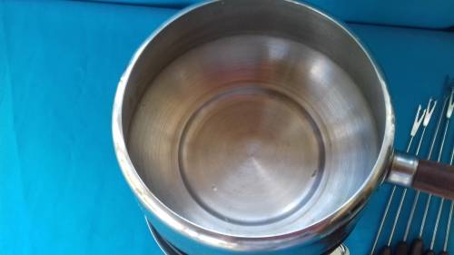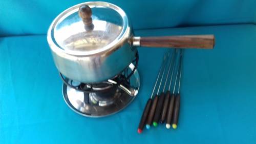 STAINLESS STEEL  FONDUE SET  WITH BLACK METAL STAND   + 6 FORKS     GOOD CONDITION