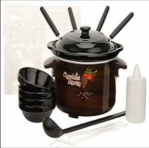 FEATURES: o Pot holds up to 24 ounces of chocolate INCLUDES: o Matching dipping bowls o Fondue forks o Chocolate mold sets o Easy pour squeeze bottle o Dipping fork and spoon o Chocolate ladle scoop o Chocolate candy sticks o Candy baggies with ties