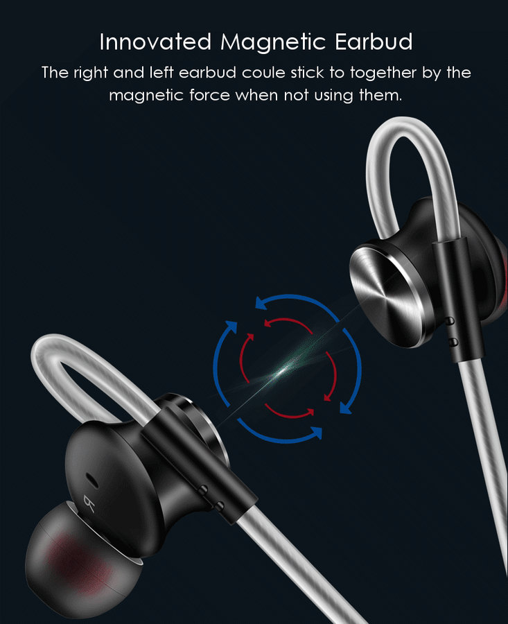 3. Innovated magnetic design, the right and left earbud could stick to each other by magnetic force.