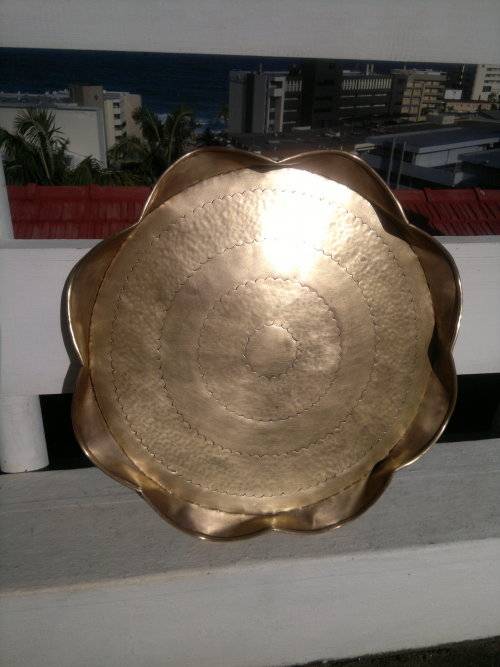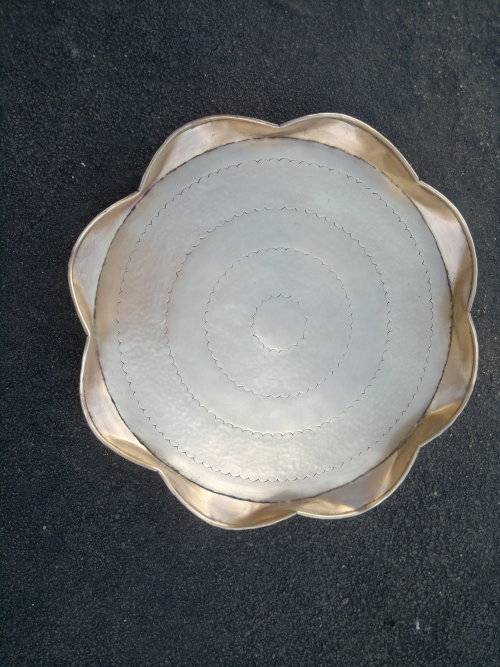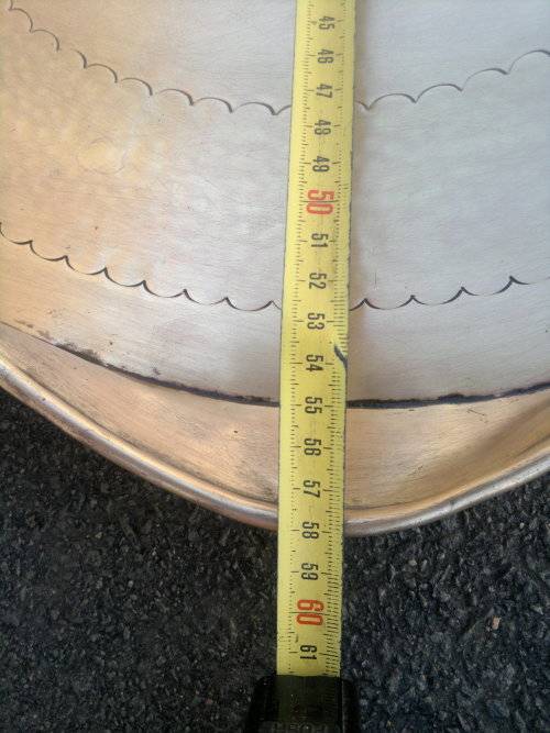 A Table Tray Very Large & Heavy solid Brass Tray Hand beaten with a lot of work on the sides. The tray is also used on a fold up table, sorry No Table. Size: 580mm Across x 45mm wide. In good condition for it's age with fair wear & tear.Sold as used S/Hand.