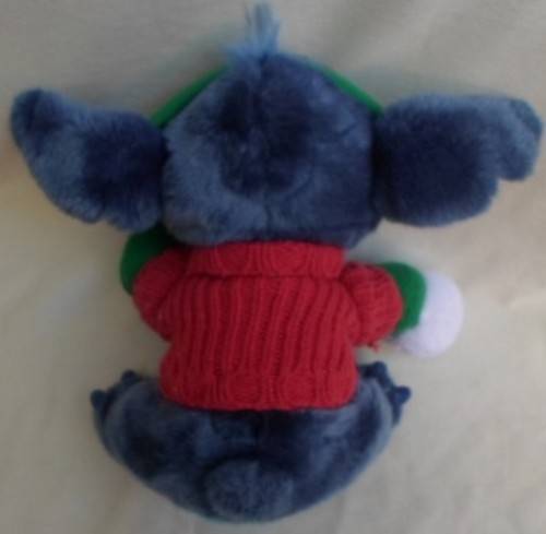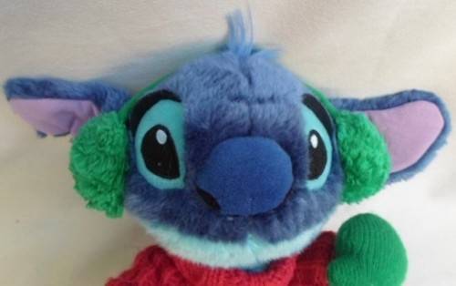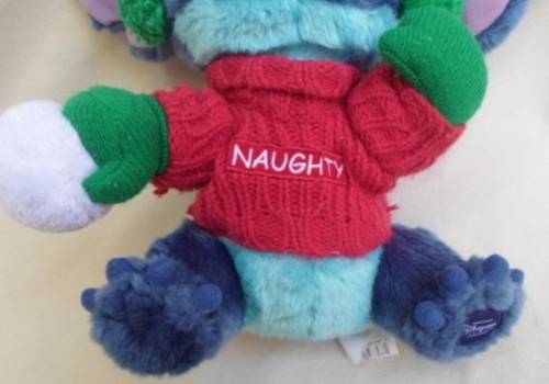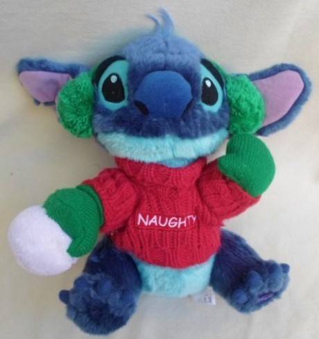 STITCH IS 30CM TALL IN SITTING POSITION AND 25CM WIDE AND IN GREAT CONDITION - SO CUTE WITH HIS EAR MUFFS AND 'NAUGHTY' JERSEY!! REFER IMAGES