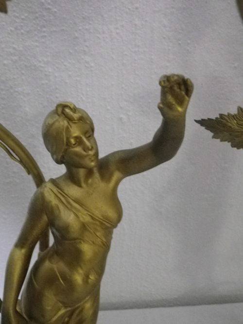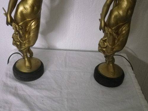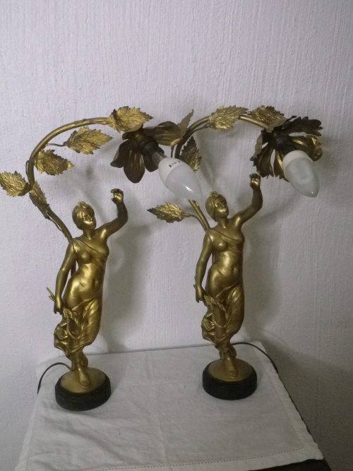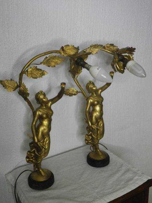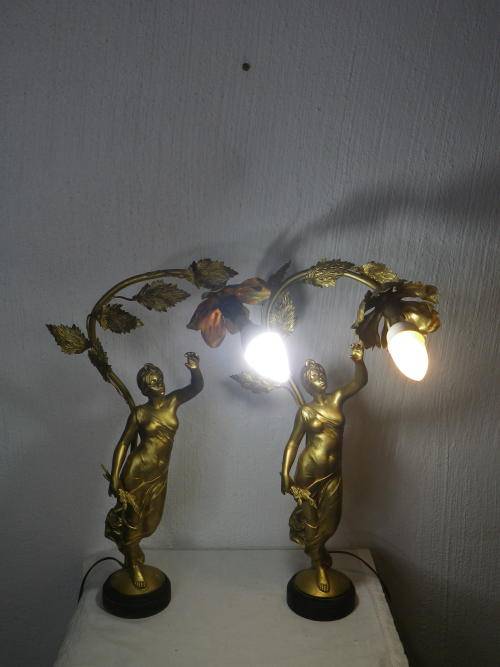 Magnificent Pair of Vintage FRENCH Gilt Tone Figural Table lamps with gorgeous detail of sensual maidens and vine leaves