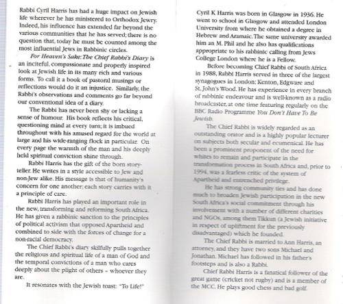 For Heaven's Sake, The Cheif Rabbi's Diar, The Chief Rabbi of the Union of Orthadox Synagoges of South africa by Cyril Harris