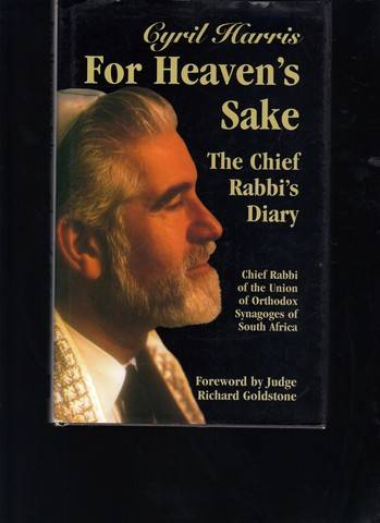 For Heavens Sake, The Chief Rabbi's Diary, Chief Rabbi of the Union of Orthodox Synagoges of South Africa, By Cyril Harris, first edition 2000, hard cover with dust wrapper, Signed by the Author, 330 pages, good condition.