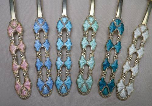 Epitome of the class & craftsmanship we've come to trust from the Scandinavian silversmiths! FIN JENSEN, NORWAY, c1950S GILDED STERLING SILVER & GUILLOCHE ENAMEL DEMITASSE SPOONS