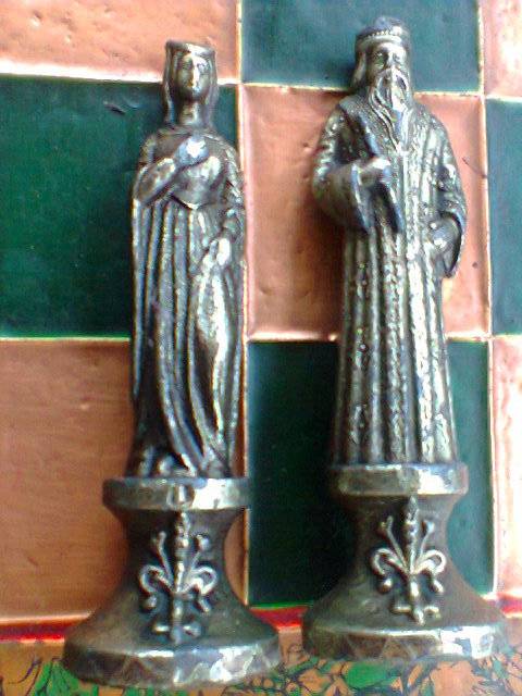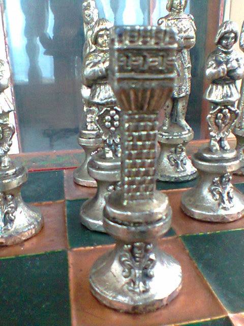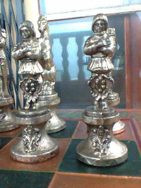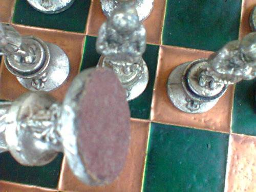 A real old Copper Board from Greece with figurine's on the border Size: 370mm x 370mm and a full set of heavy & solid metal pieces size from 65mm (Pawns) 85mm ( King's) Tall on a Metal & Mirrored Cake Stand doubling at a Plinth Size: 365mm Top & 465mm Squire bottom x 105mm Tall. Chess men & Board are felt lined under neath Please look at the photos.