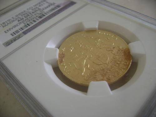 The enviromental damage on the coin I believe is from being exposed to sea water for a very long time..I do not have a certificate but I believe that this coin could have possibly have come from the shipwreck "FAME".