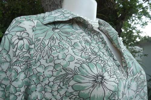 Foshini dress from the 80's in size 46/22. In beige with green floral pattern. Long cuffed sleeves. In polyester/nylon blend fabric. Loose hanging with colour and V slit on front.