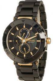 Venture into uncharted territory. This gorgeous Fossil watch features a black ceramic bracelet and round ion-plated black and goldtone stainless steel case. Multifunctional black mother-of-pearl dial with goldtone stick indices, logo and three subdials. Quartz movement. Water resistant to 100 metres. 11-year limited warranty.