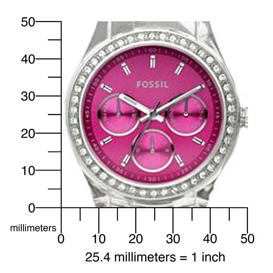 Brand Name: Fossil Model number: ES2604 Part Number: ES2604 Item Shape: round Dial window material type: Mineral Display Type: analog Clasp: fold-over-clasp Case material: Plastic Case diameter: 40 millimeters Case Thickness: 10 millimeters Band material: Plastic Band length: womens-standard Band width: 18 millimeters Band Color: white Dial color: pink Bezel material: Plastic Bezel Function: stationary Calendar: day-and-date Special Features: water-resistant item-weight: 16 Ounces Movement: Analog-Quartz Water resistant depth: 165 Feet