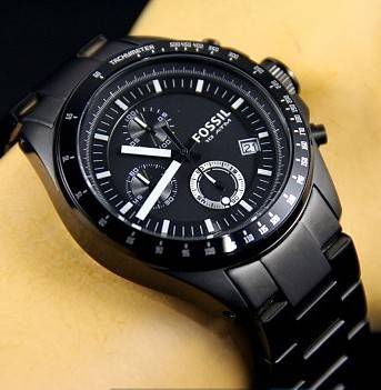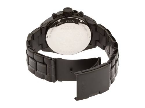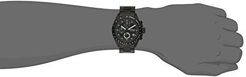Black ion-plated stainless steel case and link bracelet. Fixed black ion-plated bezel showing tachymeter markings. Black dial with luminous hands and index hour markers. Minute markers around the outer rim. Luminescent hands and markers. Date display appears at the 4 o'clock position. Chronograph - three sub-dials displaying: 12 hours (dual time), 60 minutes and 60 seconds. Quartz movement. Scratch resistant mineral crystal. Solid case back. Case diameter: 44 mm. Case thickness: 13 mm. Deployment clasp. Water resistant at 100 meters/ 330 feet. Functions: hours, minutes, seconds, date, chronograph, tachymeter. Fossil Black Stainless Steel Chronograph Men's Watch CH2601.