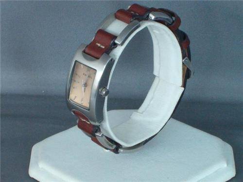 This retro inspired women's watch features a genuine brown leather band with silver hardware rectangular champagne dial with three-hand quartz movement. Includes an adjust-o-matic bracelet. Packaged in a collectible tin. Water resistant up to 30 meters.