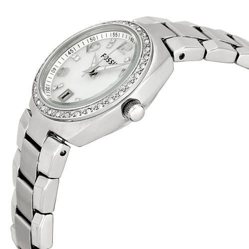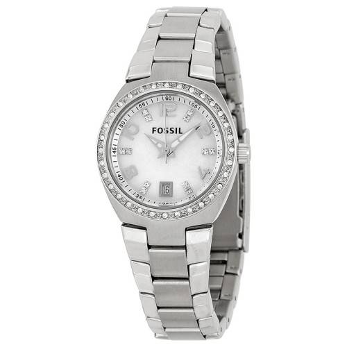 Fossil Ladies AM4141 Serena Silver-Tone Stainless Steel Watch with Link Bracelet Features:- Round silver-tone watch with 28 mm stainless steel case and mineral dial window- Japanese quartz movement with analog display- Featuring silver-tone bezel with crystal studding, fluted crown, placed crystals.