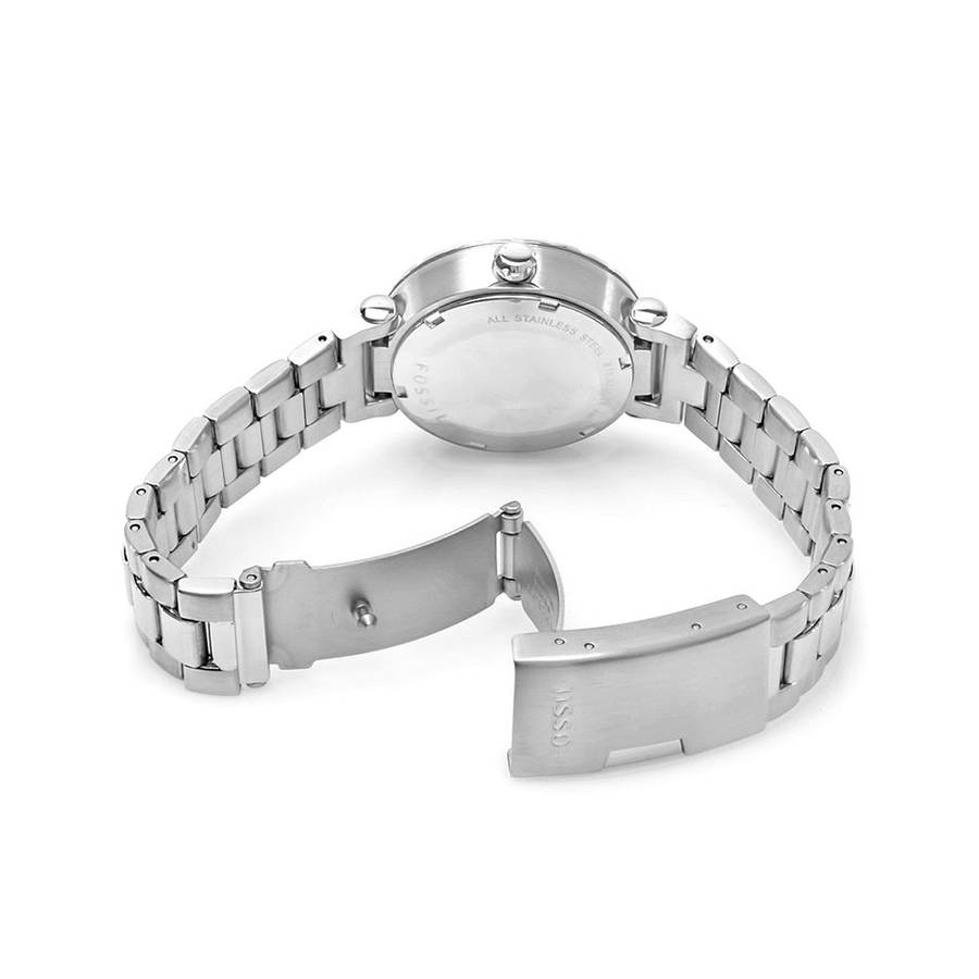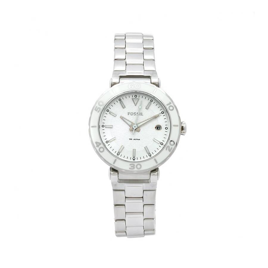 Brand Name: Fossil Model number: AM4279 Part Number: AM4279 Model Year: 2011 Item Shape: round Dial window material type: Mineral Display Type: analog Clasp: fold-over-clasp Case material: stainless-steel Case diameter: 40 millimeters Case Thickness: 10 millimeters Band material: stainless-steel Band length: womens-standard Band width: 12 millimeters Band Color: silver Dial color: white Bezel material: stainless-steel Bezel Function: stationary Calendar: Date Special Features: screw-down-crown, shock-resistant, water-resistant item-weight: 2.40 Ounces Movement: Japanese-Quartz Water resistant depth: 330 Feet