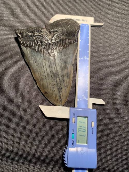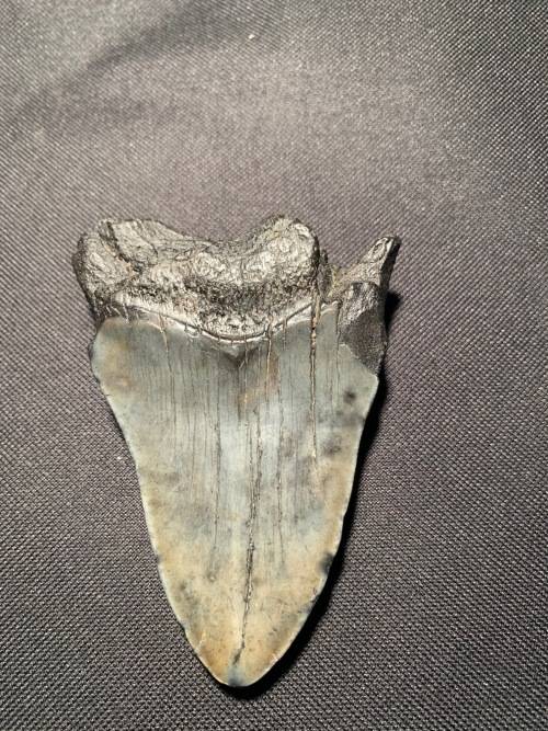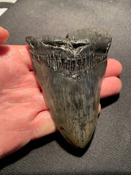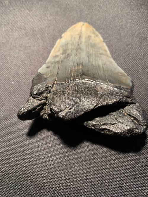 This large fossil shark tooth from Carcharodon megalodon species, ancestor of the Great White, which grew several times the size. Measures over 110 mm along the slant. A tooth of many colours, dark steel grey enamel, serration is left, the enamel near the one side on top of the root is somewhat eroded (true pathology) this is a normal phenomenon. This is an awesome shark tooth! Root has not been repaired; however, some erosion is visible on the gum and unfortunately a bigger chunk of the root has broken off on the left side. It is an impressive hand full to say the least. Estimated 10 million years old. Pleistocene to Miocene geologic time. A great addition to any collection. 100 % Guaranteed Authentic fossil shark tooth! No repairs, no restoration, no polishing. Fantastic shape, this huge shark tooth is a very cool! Imagine the size of the shark up to 30 m long!