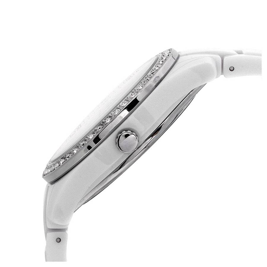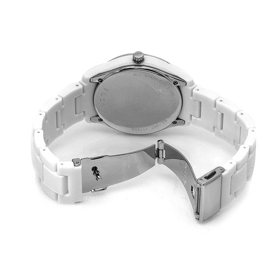 Brand Name: Fossil Model number: ES1967 Part Number: ES1967 Item Shape: round Dial window material type: Mineral Display Type: analog Clasp: deployment-clasp-with-push-button Case material: Resin Case diameter: 42 millimeters Case Thickness: 11 millimeters Band material: Resin Band length: womens-standard Band width: 18 millimeters Band Color: white Dial color: white Bezel material: stainless-steel Bezel Function: stationary Special Features: screw-down-crown, shock-resistant, water-resistant Movement: Japanese-Quartz Water resistant depth: 165 Feet