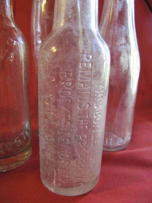 1. "Brookes Lemos Ltd Cape Town, Only Contents Sold. This Bottle is and Remains the Property of Brookes Lemos Ltd Cape Town". 180mm high x 50mm diameter.