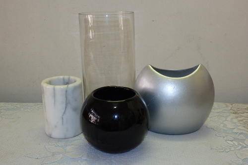 THIS FANTASTIC COLLECTION OF FOUR ASSORTED VASES INCLUDE A LARGE GLASS VASE (30cm TALL x 14.5cm ACROSS), TWO CERAMIC VASES (BLACK VASE = 15.5cm ACROSS x 13.5cm TALL AND THE SILVER VASE = 21cm LONG x 11.5cm WIDE x 17.5cm TALL) AND A MARBLE VASE (10cm ACROSS x 14cm TALL). THERE IS AGE AND USAGE RELATED WEAR AND TEAR, BUT THE VASES ARE STILL IN GREAT CONDITION. THE MARBLE VASE HAD A CANDLE IN IT, SO HAS A CANDLE BURN MARK ON THE INSIDE.