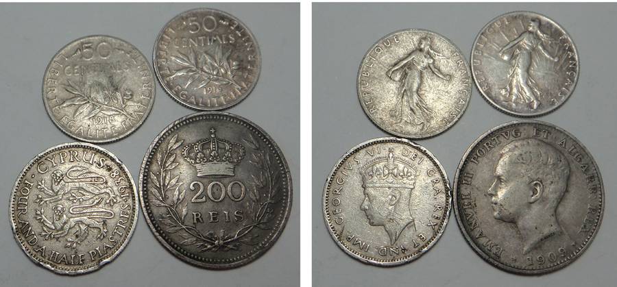 The coins are two French 50-Centimes (1916 & 1918) a 200-Reis of Portugal (1909) and a damaged Half Piastres of Cyprus (1938).