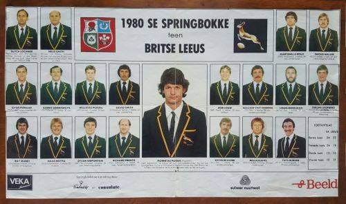 Below : Original poster (supplement) to a 1980 'Beeld' newspaper of the Springboks who played against the British Lions in 1980. The poster measures 530mm x 300mm. Fold mark through the middle, but in a good condition for its age.