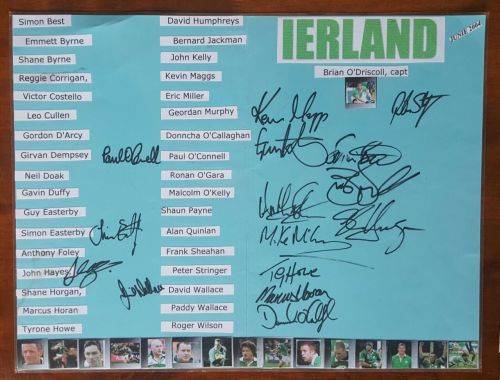 Below : 180gsm Board with all the names, some pictures and 15 original autographs of the Irish rugby players who toured South Africa in 2004. The board is laminated and measures 460mm x 350mm.