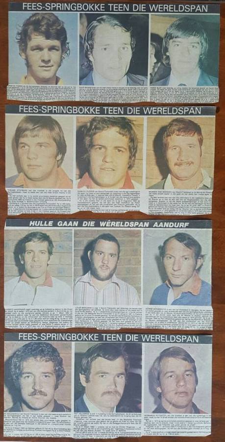 Below : Newspaper pictures of 12 of the Springboks who played against the World XV in 1977. Each of the four newspaper cuttings measure 385mm x 180mm.