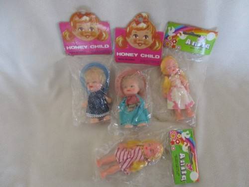 NOT EXPENSIVE DOLLIES IN THEIR DAY BUT STILL BEAUTIFULLY PRESERVED IN ORIGINAL PACKAGING. THE TWO HONEY CHILD DOLLIES ARE 10.5CM TALL AND THE TWO ANITA DOLLIES ARE 11.5CM TALL. REFER IMAGES