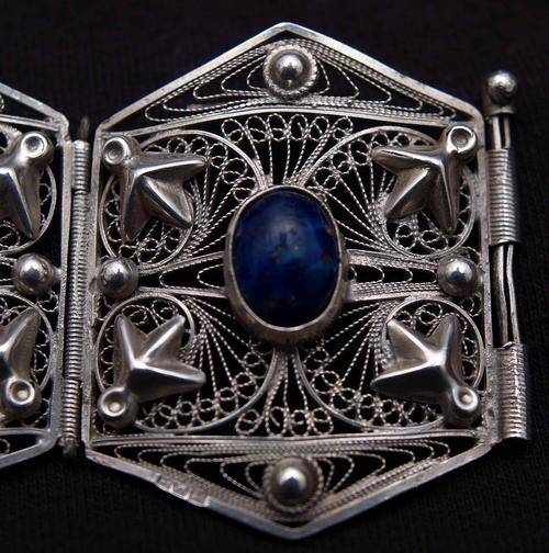 *An absolutely stunningly detailed Egyptian filigree bracelet set with five gorgeous solid Lapis Lazuli stones. It is hallmarked with Egyptian hallmarks for 1936. Length is 180mm.