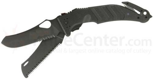 Fox 49 Degree Capricorno. 5 7/8" closed linerlock. N690Co colbalt vanadium stainless partially serrated blade and 420J2B saw blade. Both have black MILSPEC coating. Black G-10 handles with seatbelt cutter glass breaker. Lanyard hole. Pocket clip.