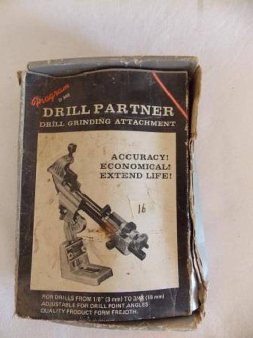 FRAGRAM DRILL PARTNER DRILL GRINDING ATTACHMENT ROR DRILLS FROM 1/8" (3mm) - 3/4" (18mm). ADJUSTABLE FOR DRILL POINT ANGLES. SHIPPING COSTS R50.00
