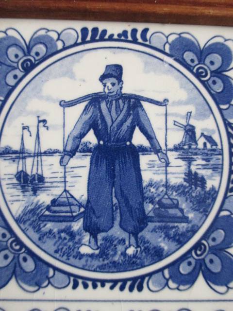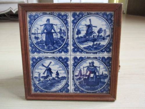 Framed Delft blue & white tiles. size: 17cm x 17cm.