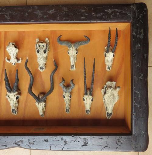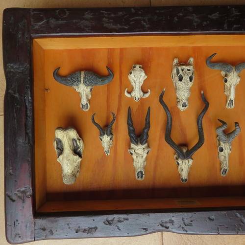 FRAMED MINIATURE ANIMAL SKULLS, SLEEPER FRAME- MEASURES 46X72 CM