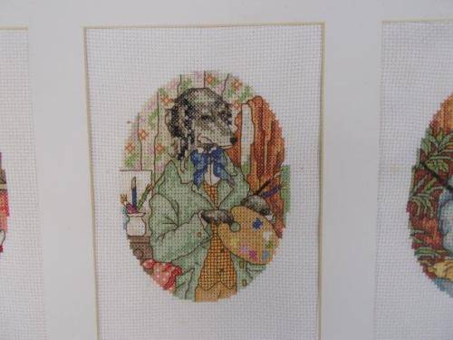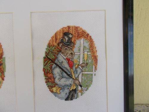 Pretty framed no glass dog scene tapestry item in good used condition no damage noted