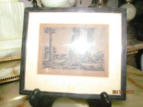 Framed in Solid wood frame with Protective Glass, this antique (Late 1800's early 1900's) Lithograph portrays a small area of Forest with Two large Trees and a smaller tree to their left with abundant shrubbery. On the Bottom left of the Lithograph is a signature