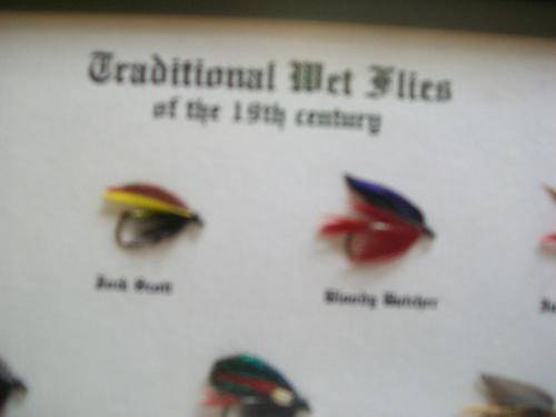 Framed Fly Fising: Royal Coachman, Jack Scott, Bloody Butcher, Red Tail, Peter Ross, Alexander jr, Greenwill Glory, Soldier Palmer, Black Zulu, Coch Bandhu, Black Fennel. Lovely condition 80 x 40 cm.