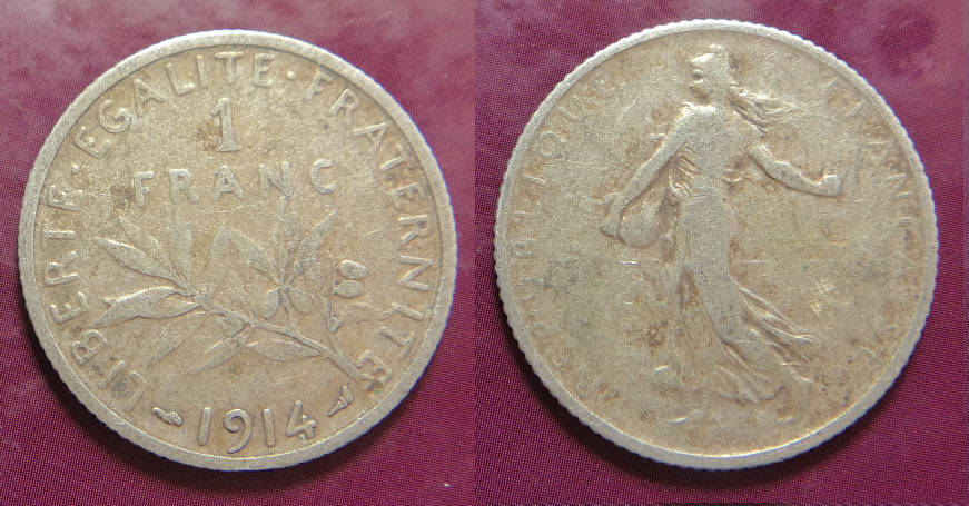France: Silver 1 Franc (La Semeuse /The Sower) of 1914